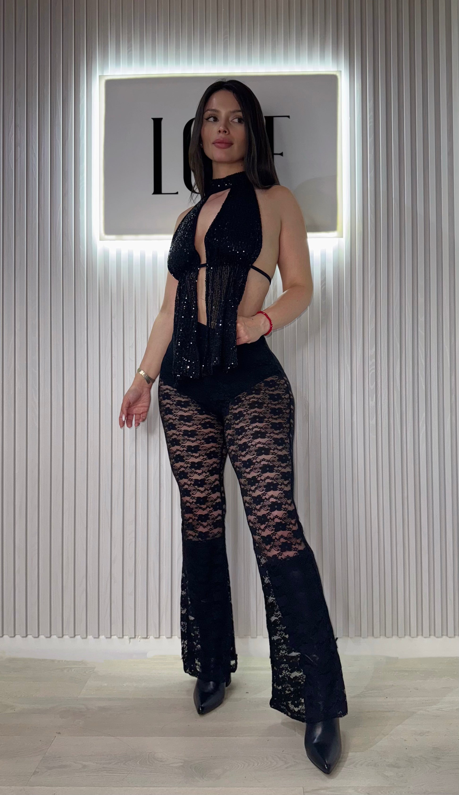 Flare Encaje Noir combina elegancia y audacia en una sola prenda. Confeccionado en delicado encaje negro, su diseño de tiro alto y corte acampanado estiliza la figura y aporta un toque sofisticado a cualquier look.